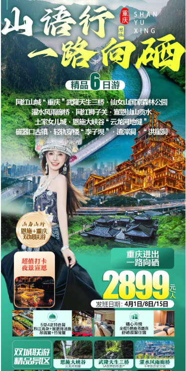 恩施+重庆双城联游6日2899·4月8日·余15🌿 穿越山城 · 一路向硒① 一次打卡武隆天坑·仙女山·狮子关·恩施大峡谷② 逛遍濯水古镇·女儿城·长寿古镇·磁器口③ 打卡李子坝·白公馆·洪崖洞璀璨夜景🏞️ 山水奇观 + 古镇风情 + 网红山城全搞定带你沉浸式玩转渝鄂最美风光!