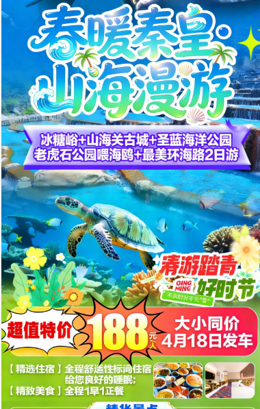 🌸春游踏青游山海188元/人🧍♂️👫两人报名💥360元/两人🗓4 🈷️18日发车1️⃣晚2️⃣天1️⃣北方小九寨的「冰糖峪」大峡谷2️⃣圣蓝皇家海洋公园看海豚🐬海狮🦭3️⃣🐦 老虎石公园:海风拂面,鸥鸟逐浪,掌心投喂,定格人与海的温柔瞬间。4️⃣天下第一雄关山海关古城5️⃣🌊 北戴河最美环海路:左手蔚蓝大海,右手葱郁山林,一路海风与日落🌇,皆是治愈的浪漫。🏨升级一晚舒适型宾馆住宿🍱一早一正餐社会餐厅用餐